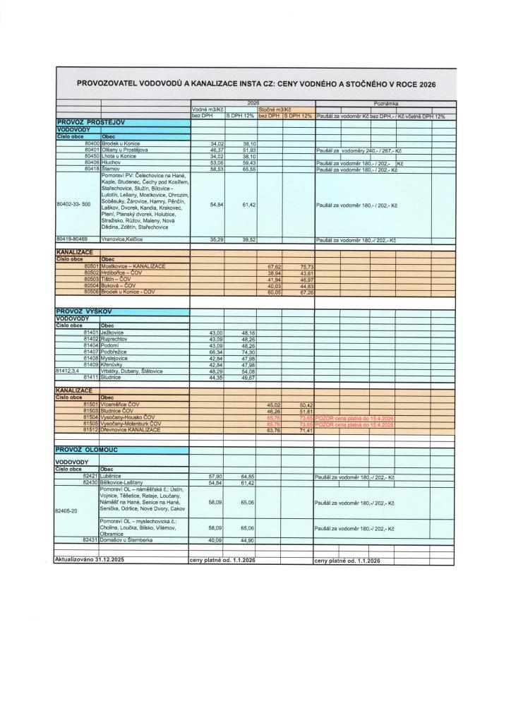 Provozovatel INSTA CZ - ceník vodného od 1.1.2026 v Náměšti na Hané činí 65,06 Kč vč. DPH, paušál za vodoměr 202 Kč vč. DPH.