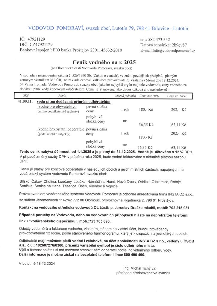 Vodovod Pomoraví, svazek obcí, zveřejnil ceník vodného pro Olomouckou část na rok 2025, schválený 54. Valnou hromadou. Ceny platí od 1. ledna do 31. prosince 2025 a zahrnují 12% DPH. Ceník je platný pro obce napojené na vodárenský systém. Odběratelé mohou platit zálohově a stanovit si splátky podle individuálního odběru. Provozovatelem systému je INSTA CZ s.r.o. Další informace jsou dostupné na bezplatné lince 800 490 490.