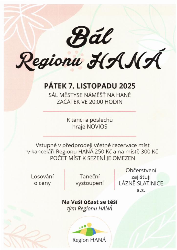Region HANÁ srdečně zve všechny milovníky tance a dobré zábavy v pátek 7. listopadu 2025 od 20 hodin na Bál Regionu HANÁ, který se uskuteční na sále městyse v Náměšti na Hané. K tanci a poslechu hraje skupina NOVIOS. Občerstvení zajištují Lázně Slatinice. Proběhne i losování o hodnotné ceny. Vstupenky v předprodeji za 250,-Kč zakoupíte na Regionu HANÁ, po tel. dohodě na 777 235 160, na místě za 300,-Kč. Srdečně zvou pořadatelé!