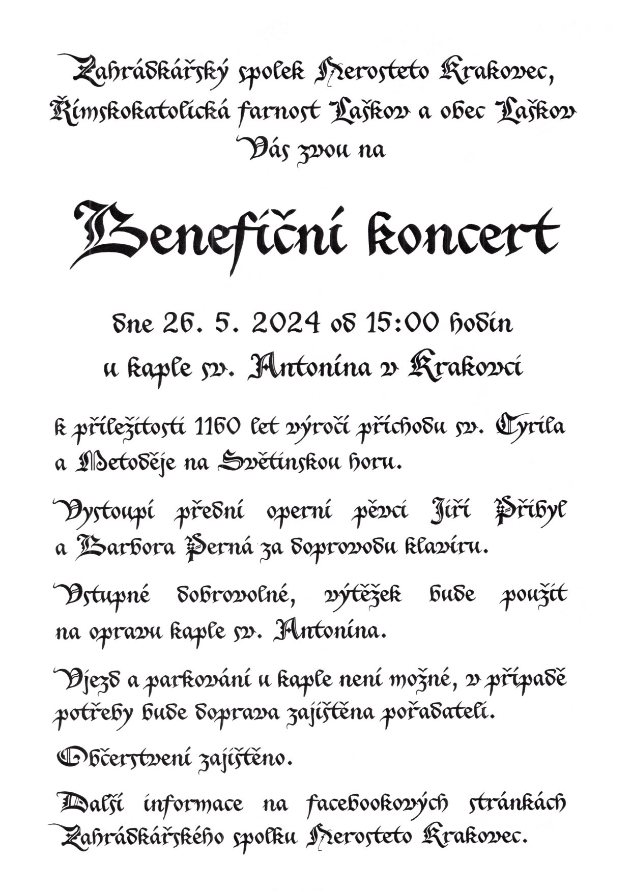 Zahrádkářský spolek Nerosteto Krakovec si Vás dovoluje srdečně pozvat na benefiční koncert u kaple sv. Antonína v Krakovci, který se bude konat dne 26.5.2024 od 15:00 hodin. Na koncertu vystoupí přední operní pěvci. Na Vaši účast se těší pořadatelé.