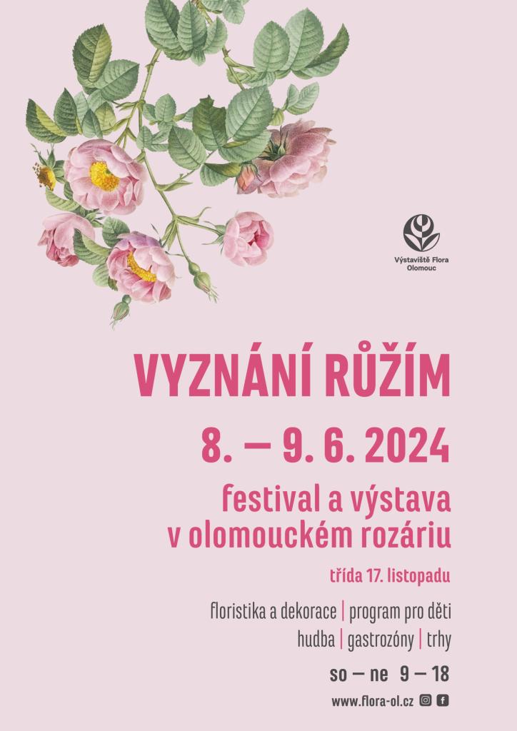 „Festival Vyznání růžím – tisíce keřů růží v plném květu, záplava barev i vůní, bohatý doprovodný program a pohodová atmosféra. To vše v jedinečném olomouckém rozáriu. Nejlevnější vstupenky koupíte na webu výstaviště flora www.flora-ol.cz. Vyznání růžím 8. – 9. června v olomouckém rozáriu.“
