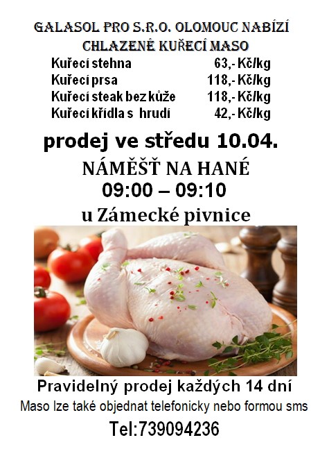 Firma Galasol Olomouc bude ve středu 10.dubna v době od 09:00 do 09:10 u Zámecké pivnice prodávat chlazené kuřecí maso. Nabízí kuřecí stehna 63,- Kč/kg, kuřecí křídla s hrudí 42,- Kč/kg, kuřecí prsa 118,- Kč/kg a kuřecí steak bez kůže 118,- Kč/kg.