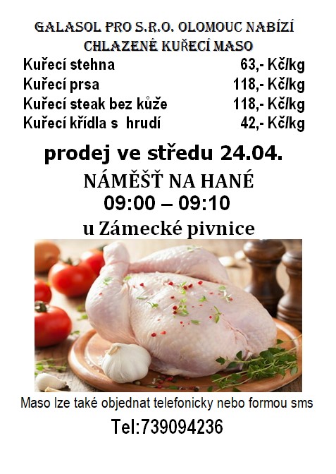 Firma Galasol Olomouc bude ve středu 24.dubna v době od 09:00 do 09:10 u Zámecké pivnice prodávat chlazené kuřecí maso. Nabízí kuřecí stehna 63,- Kč/kg, kuřecí křídla s hrudí 42,- Kč/kg, kuřecí prsa 118,- Kč/kg a kuřecí steak bez kůže 118,- Kč/kg.