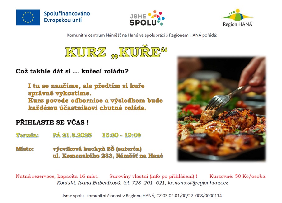 Komunitní centrum Náměšť na Hané ve spolupráci s Regionem Haná pořádá 21. března od 16:30 - 19.00 ve výcvikové kuchyni ZŠ ul. Komenského 283 v Náměšti na Hané - KURZ VYKOŠTĚNÍ KUŘETE.