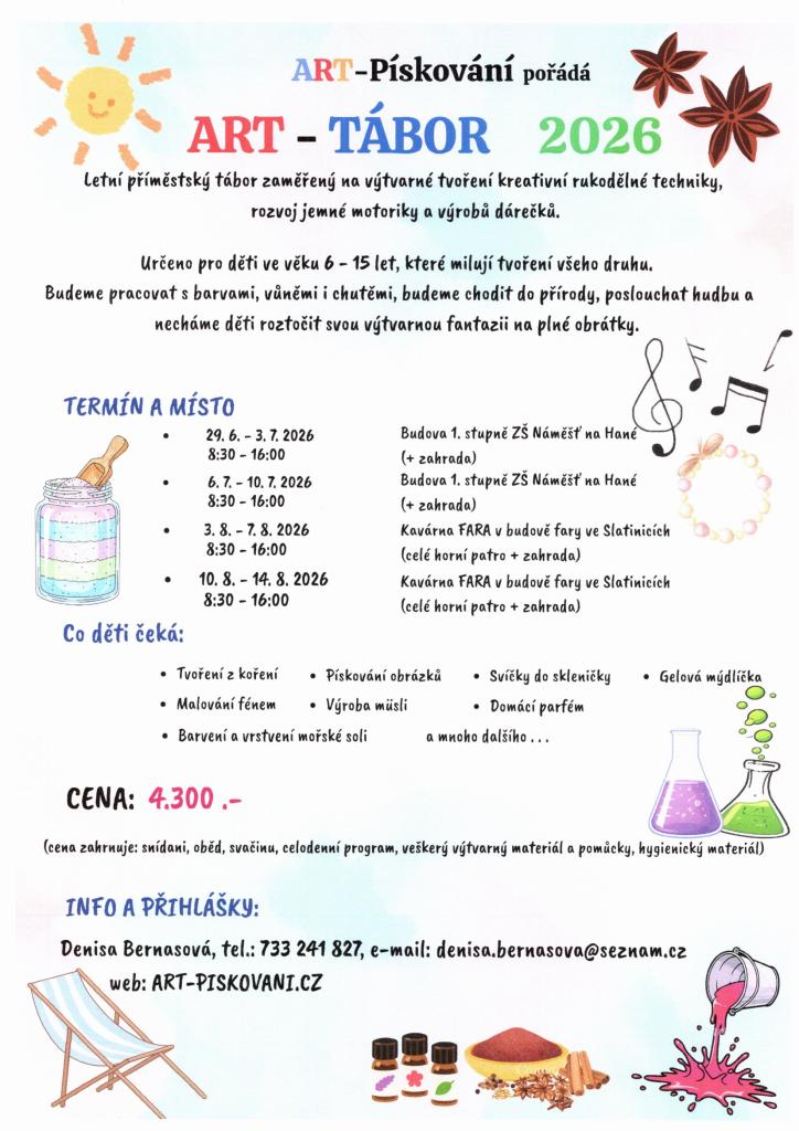 ART - Pískování pořádá letní příměstský tábor zaměřený na výtvarné tvoření kreativní rukodělné techniky...