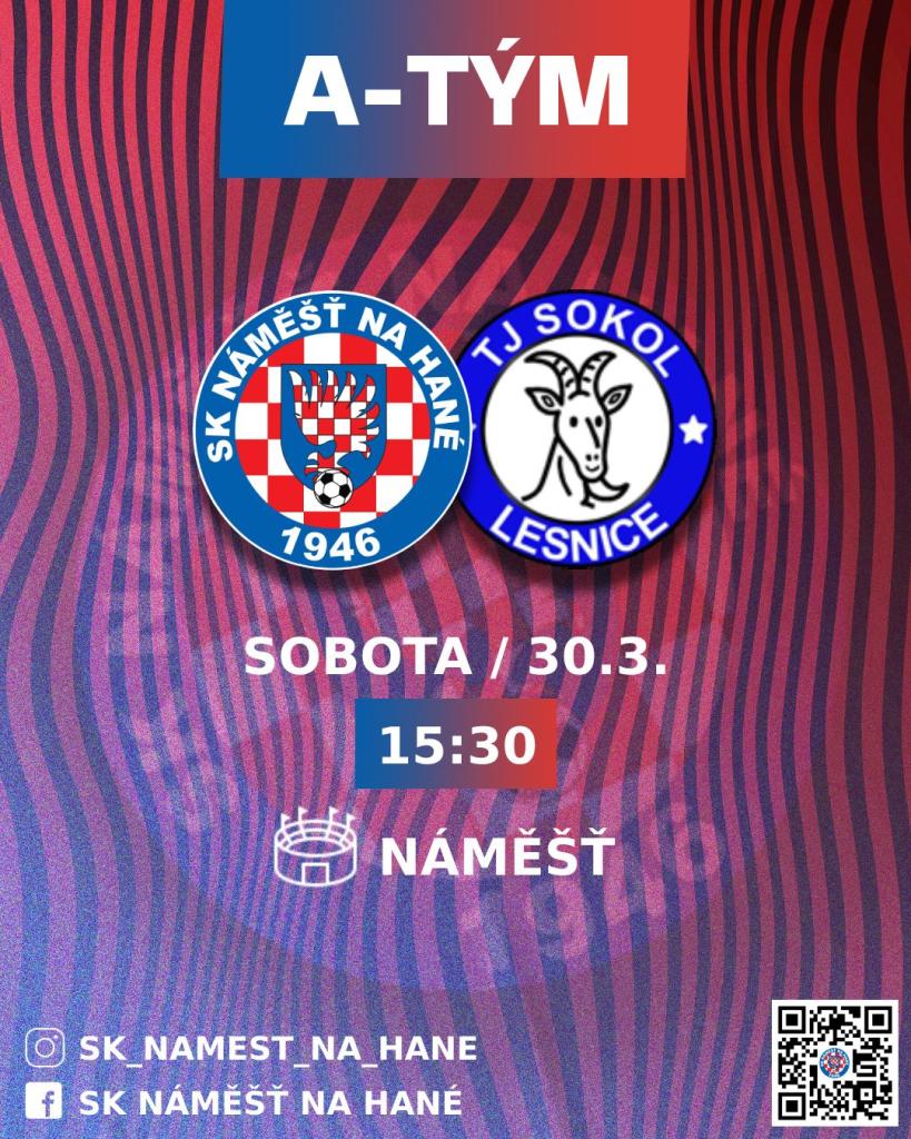 Zveme příznivce náměšťské kopané na první domácí zápas v jarní části fotbalové sezóny 2023/2024. Začátek v 15:30 na fotbalovém stadionu v Náměšti na Hané. Soupeřem bude mužstvo z Lesnice. Občerstvení zajištěno.