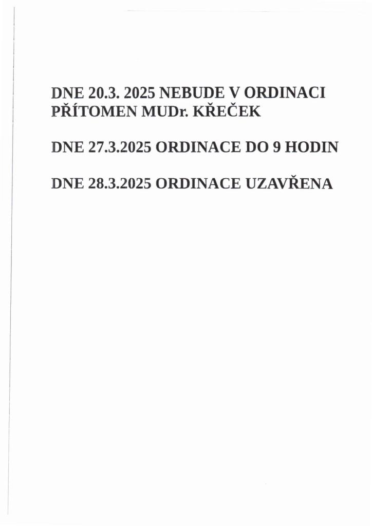 DNE 20. 3. 2025 NEBUDE V ORDINACI PŘÍTOMEN MUDR. KŘEČEK 27. 3. 2025 ORDINACE DO 9 HODIN 28. 3. 2025 ORDINACE UZAVŘENA