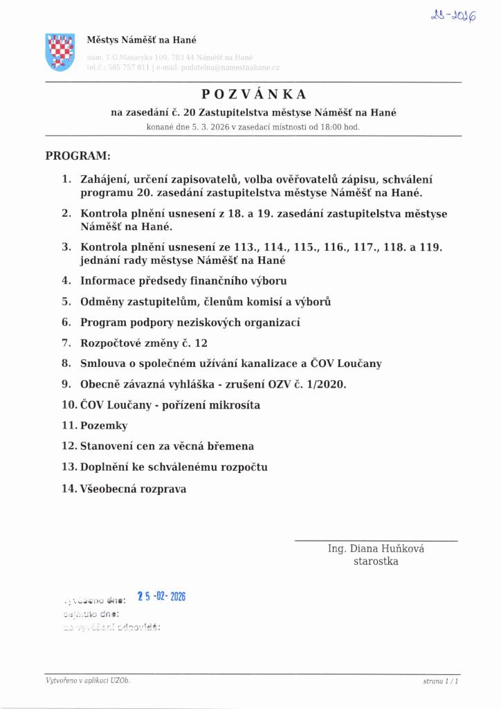 Pozvánka + program na zadání č.20 Zastupitelstva městyse Náměšť na Hané konané 5.3.2026