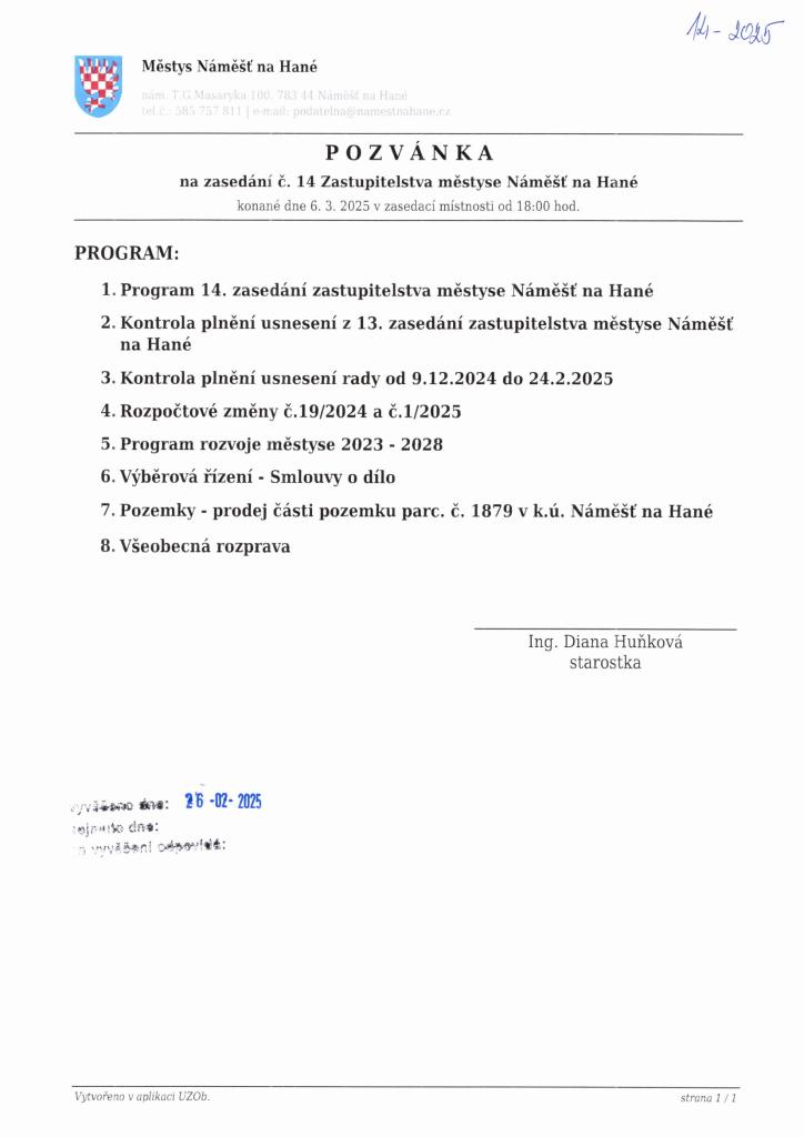 Pozvánka + program zasedání č. 14 Zastupitelstva městyse Náměšť na Hané konané 6.3.2025