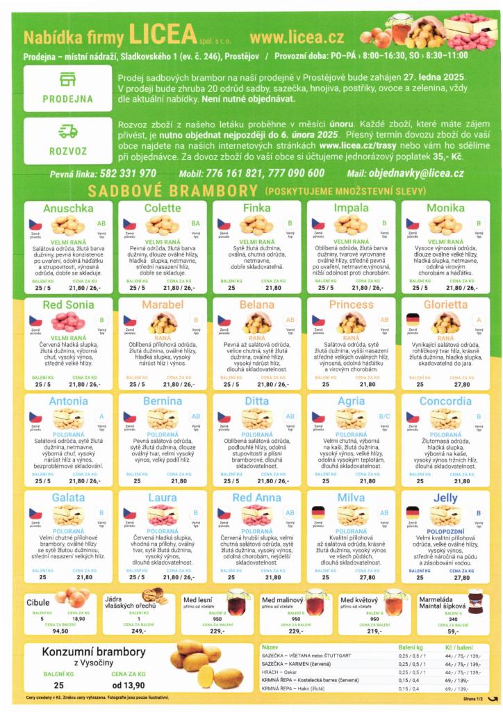 Firma Licea Prostějov, místní nádraží, oznamuje, že opět zahájila prodej sadbových brambor a dalšího sortimentu pro sezonu 2025, na prodejně v Prostějově. Opět přijímá objednávky na rozvoz zboží do vaší obce. Aktuální leták je k dispozici na internetových stránkách www.licea.cz.