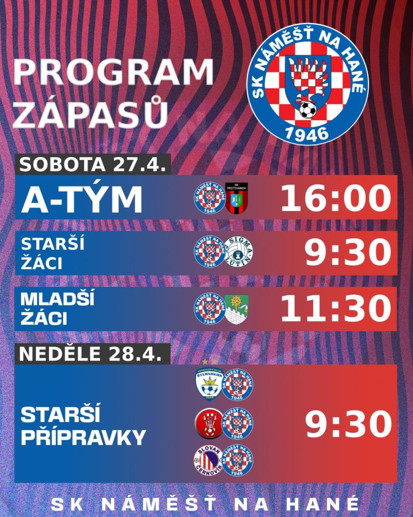 Hráči a funkcionáři SK Náměšť na Hané zvou diváky na sobotní utkání: od 9:30 starší žáci SK vs. Lutín/Těšetice od 11:30 mladší žáci SK vs. FK Horka nad Moravou od 16:00 muži SK vs. SK Protivanov Občerstvení zajištěno.