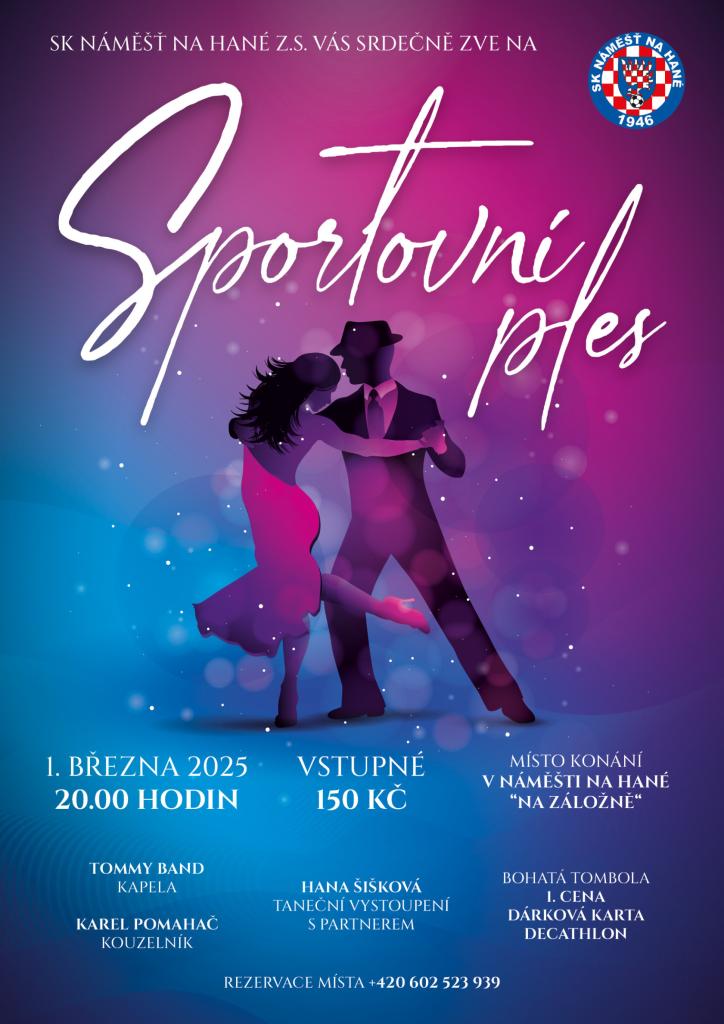 Spolek SK Náměšť na Hané vás srdečně zve na sportovní ples, který se koná v sobotu 1. března od 20 hod. na sále kulturního zařízení městyse. K poslechu hraje skupina TOMMY BAND. Vstupné 150 Kč. V rámci programu vystoupí Hana Anna Šišková se svým tanečním partnerem (vicemistryně ČR 2019 v kombinaci 10 tanců) a kouzelnické vystoupení Karla Pomahače.