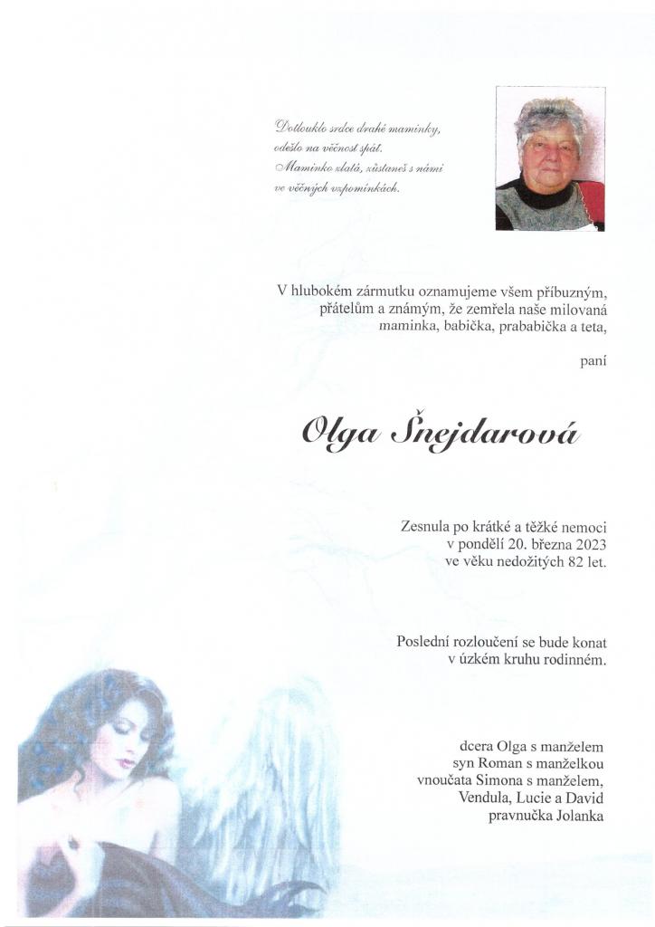 Olga Šnejdarová ve věku nedožitých 82 let. Poslední rozloučení se bude konat v úzkém kruhu rodinném.
