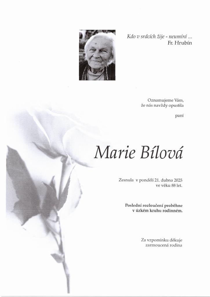 Marie Bílová ve věku 88 let. Poslední rozloučení proběhne v úzkém kruhu rodinném.
