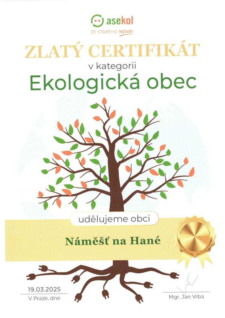 S radostí oznamujeme, že naše obec Náměšť na Hané získala ZLATÝ CERTIFIKÁT v kategorii "Ekologická obec" od společnosti ASEKOL. 💚